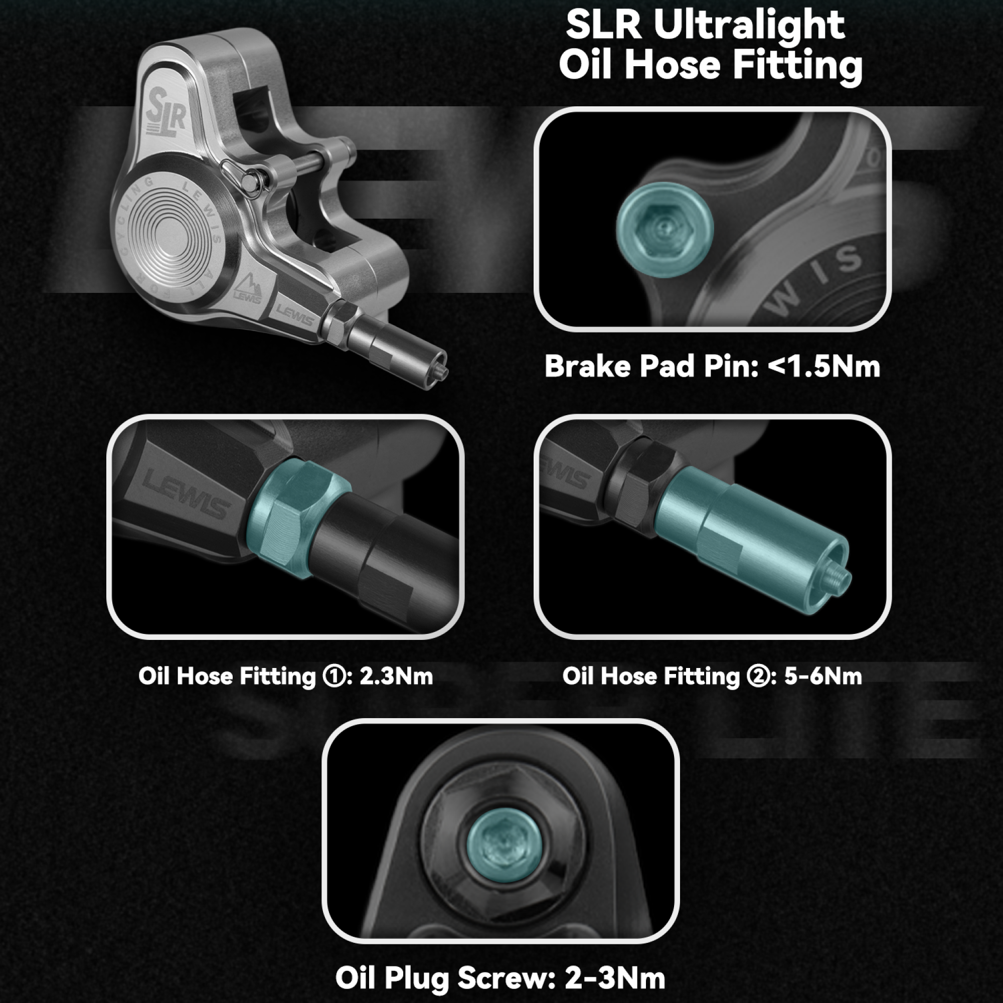 The Lewis SLR is the lightest flat mount road caliper we’ve ever produced—built for riders chasing every performance advantage. Precision CNC-machined from 7075-T6 aluminum and equipped with titanium pistons and hardware, the SLR delivers uncompromising braking power at an astonishingly low weight of just 68.5g (without pads or fittings). The caliper comes with a standard 2.6g stainless alloy line fitting and also an ultra-lightweight 1.5g alloy brake line fitting. Each version of said fitting has a specific torque required.